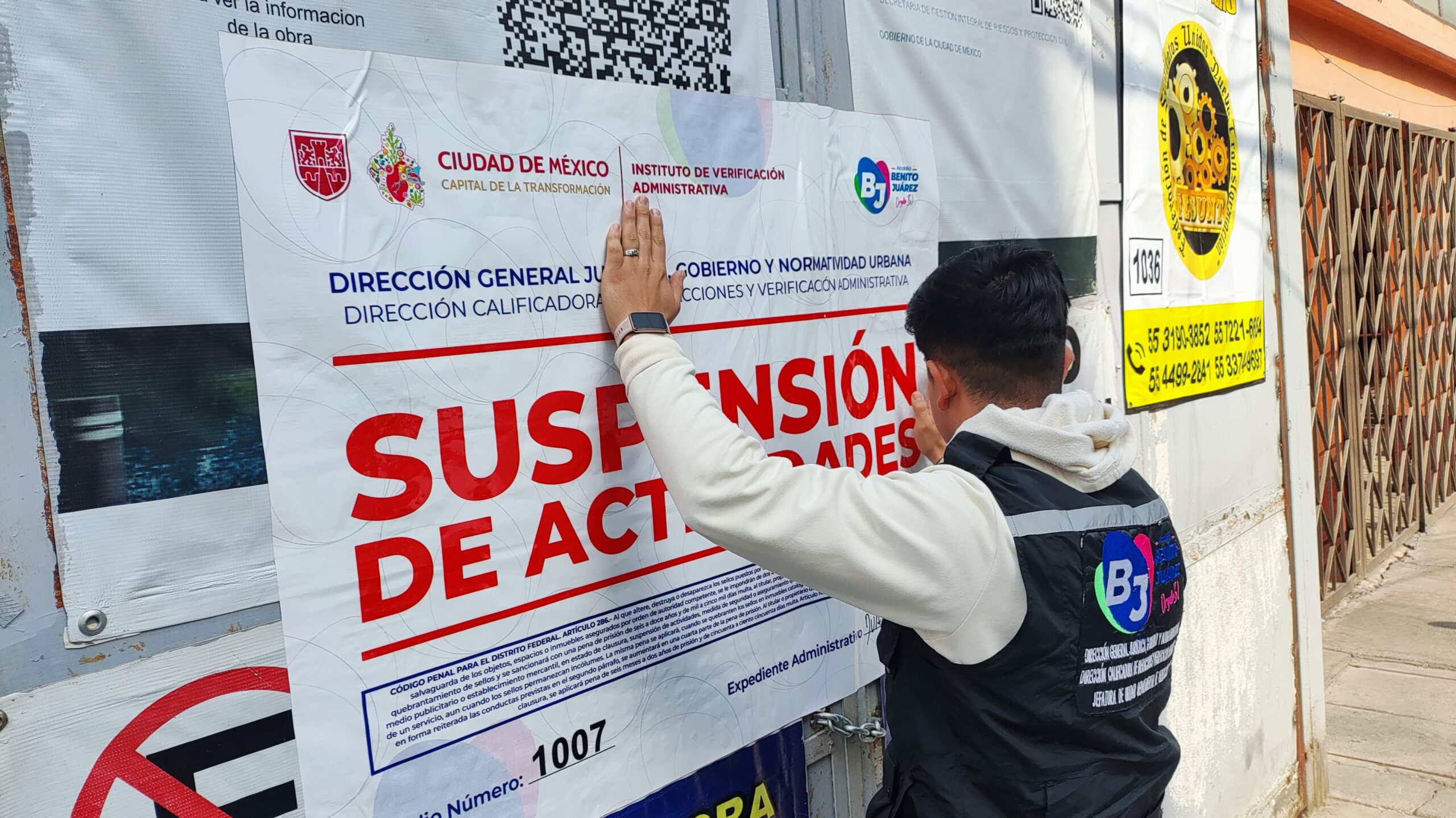 “El día de hoy nos encontramos en la colonia Albert, en la obra de la calle Víctor Hugo 19. Estamos aquí para la colocación de los sellos de suspensión por medidas de seguridad. La seguridad de las y los vecinos de Benito Juárez es nuestra prioridad, reafirmando el compromiso de nuestro alcalde Luis Mendoza”, declaró Katya Duarte, jefa de Unidad Departamental de Verificación.