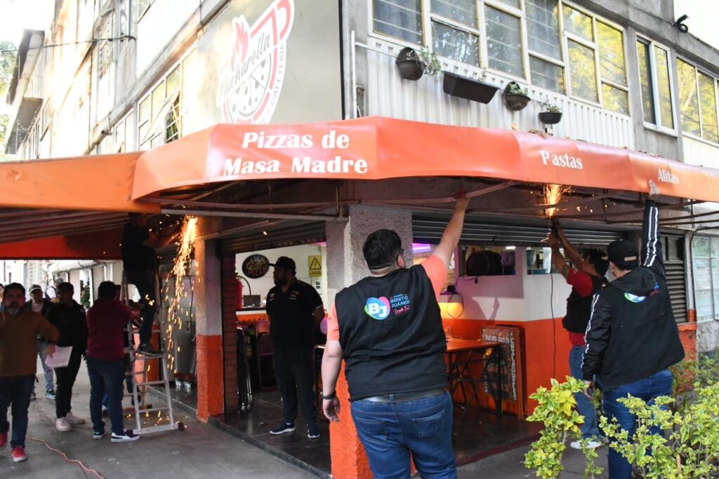 Como parte de las acciones para el ordenamiento y la recuperación del espacio público en la alcaldía Benito Juárez, fueron retirados enseres y estructuras que invadían la vía pública en el restaurante-café Mucharella, ubicado en Estafetas número 129, esquina con Castilla, colonia Postal.
